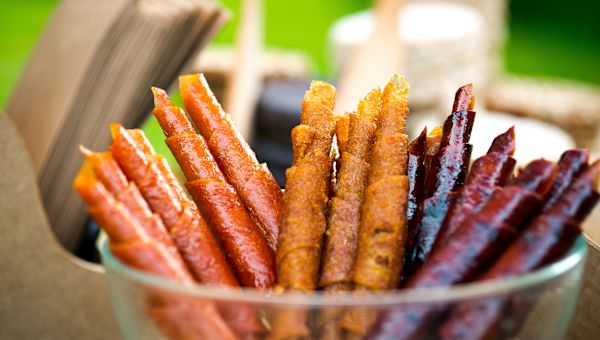Blend 3 cups of your favorite fruit with a tablespoon or two of lemon or lime juice and two pitted dates (for added sweetness). Spread your mixture onto a baking sheet lined with parchment paper or a Silpat sheet and bake at 150 degrees Fahrenheit for 6 to 8 hours. Allow to cook and cut into about 10 strips.