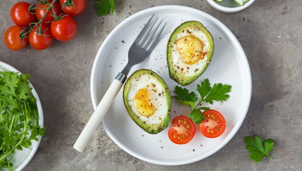 For another tasty but simple breakfast option, slice one medium avocado in half and place onto a baking sheet. Crack one whole egg into the center and bake at 425 degrees Fahrenheit for 15 to 20 minutes. Top with sliced green onions, a drizzle of hot sauce, or your favorite fresh herbs before cutting into your creation. Altogether, it contains about 235 calories.